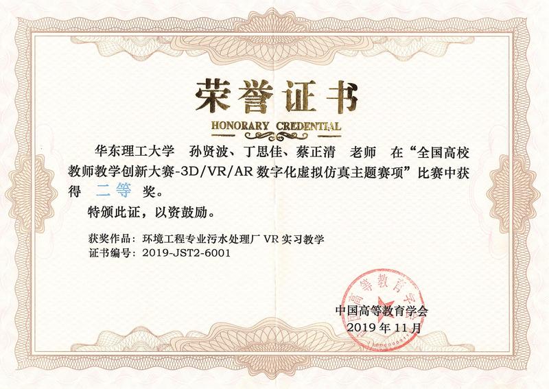 2019年11月1日至3日,由中国高等教育学会举办的“全国高校教师教学创新大赛-3D/VR/AR数字化虚拟仿真主题赛项”在南京顺利举行。本次赛事中,kaiyun开云官网教师孙贤波、丁思佳、蔡正清负责的《环境工程专业污水处理厂VR实习教学》荣获二等奖。