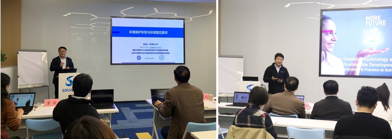 随后,校企双方作了以“化学推动绿色发展”为主题的学术交流。修光利与索尔维集团工艺开发实验室经理陈卫分别作了题为“环境保护形势与环境管控要求”和“索尔维的实践和探索”的两场学术报告。