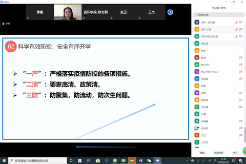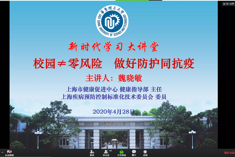 为有序推进师生分批返校复工复学并科学有效做好返校后疫情防控工作,4月28日,资环学院举办第九期“新时代大讲堂”及全院教师会议,邀请上海市健康促进中心健康指导部主任魏晓敏围绕“校园≠零风险,做好防护同抗疫”主题,为大家讲解学生分批返校后校园内可能存在的风险环节以及防护要点。资环学院全体教师、学生党支部书记、毕业班班长、团支部书记齐聚线上学习,会议由学院党委副书记曹娜主持。
