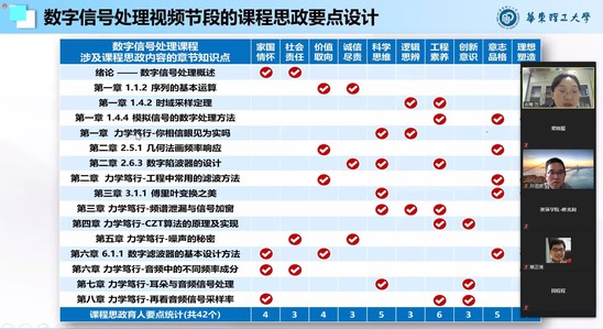 万永菁以自己承担的《数字信号处理》课程为例分享了在线教学的课程思政教学经验,从授课前对课程内涵及可拓展的思政要点的认真、用心梳理;授课中与学生鼓励性、共鸣性的开放性互动;及授课后对学生作业及答疑的交心式回复及反馈,都以润物细无声的形式达到了课程思政教学的目标。万永菁说教师的态度就是最大的课程思政,认真备课,用心授课,师生关系开放包容,自然会收获良好的效果。整场经验介绍精彩纷呈,气氛热烈,党员教师们纷纷表示获益良多。