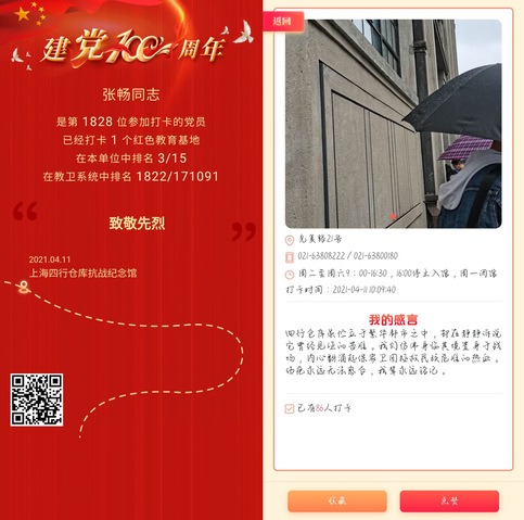 活动过程中,党支部结合学院党史学习教育安排,积极参加“我为建党百年打卡”活动,组织党员录制“百年党史我来讲”短视频,“红色基地大寻访”打卡,不断增强为实现“两个一百年”奋斗目标的责任感和使命感。