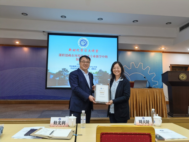 华东师范大学课程思政研究中心专家、生态与环境科学学院副院长周天舒教授为教师们作了题为“课程思政在环境生态类专业教学中的探索与实践”的辅导报告,介绍了华东师范大学课程思政工作的整体规划、体制机制和指标体系等,介绍了生态环境学院作为上海市课程思政领航学院的建设特色和经验,重点分享了《环境问题观察》、《生物多样性保护》等代表性专业课的课程思政教学案例,报告内容丰富,干货满满,对学院专业教师开展课程思政有非常强的借鉴意义。修光利书记还为周天舒教授颁发了“新时代学习大讲堂”特邀报告证书。