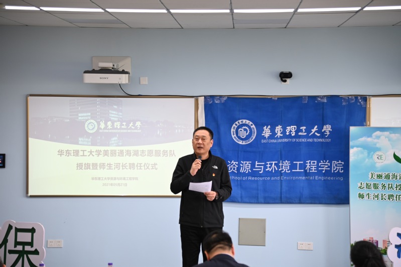 聂琦在致辞中对华理资环学院美丽通海湖志愿服务队的成立和初期的工作表示肯定和支持,他回顾了2019年奉贤区生态环境局与学院党建共建后在人才培养、科技服务等方面开展的合作情况,对学院教师发挥技术专长服务奉贤地区发展表示了感谢;特别谈到2021年六五环境日主题为“人与自然和谐共生”,希望青年学子牢固树立尊重自然、顺应自然、保护自然的理念,建设人与自然和谐共生的美丽家园。他希望在区生态环境局和华理资环学院的共同努力下,为改善校园河流环境,增强师生环保意识出一份力,将美丽通海湖志愿服务队共同打造成知行合一、专业过硬、优势创新的志愿服务队伍。随后,聂琦和修光利共同为美丽通海湖志愿服务队志愿者代表授旗并佩戴志愿服务胸牌,汪华林为奉贤校区学生河长楼江炜颁发河长聘书。