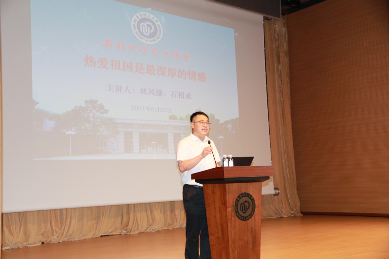 为庆祝中国共产党成立100周年,深入开展党史学习教育,弘扬爱国主义教育,传承革命精神。6月25日下午,资环学院与商学院联合举办的党史学习教育专题报告会在商学院406报告厅举行。特邀“筑梦深蓝”讲师团,原海军石家庄舰政委林风谦、原海上防险救生支队机动救生大队政治处主任石相成作了“热爱祖国是最深厚的情感”主题报告。商学院党委书记马玲、资环学院院长汪华林、党委副书记曹娜、党政领导班子及两学院的师生参加了报告会。报告由资环学院党委书记修光利主持。