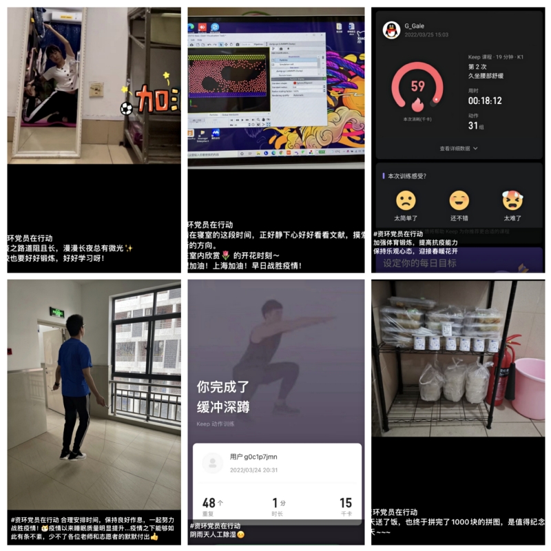 疫情当前,资环学院研究生党支部积极响应学校和学院号召,发挥党员的先锋模范作用,为校园抗击疫情贡献力量。近日,由热能化工硕博党支部牵头,其他党支部积极响应,开展了“抗疫有我!—资环研究生党员在行动”线上主题党日活动。 为了鼓舞和带动学院及班级同学积极面对疫情,党员们带头保持良好的生活作息,开展朋友圈正能量打卡活动。有的同学分享了自己在寝室内健身的经验,有的同学分享了在疫情期间读的好书、看的纪录片,有的同学分享了自己研读文献的经验,通过线上“晒图”号召大家振奋精神,共同战胜疫情! 吴晓翔、余俊钦、杨家宝等50余名党员和积极分子投入到核酸检测志愿者工作中,负责核酸检测引导和扫码工作。钱嘉澍和齐梦瑶等10余位学生党员参与所在宿舍楼内的配餐和楼层长工作,充分体现了党员在疫情面前的责任和担当。