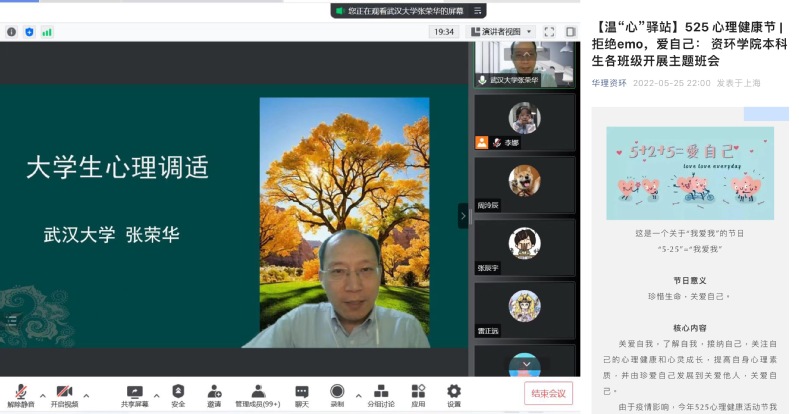 5月25日,学院特邀武汉大学副教授张荣华,为本科、研究生开展以“大学生心理调适”为主题的心理健康知识讲座,近200名学生参会学习交流。张教授从压力的来源、本质特征、产生机制等方面分析了心理失衡的原因,并从期望与现实、社会支持、情绪的表达与宣泄、体育锻炼、学业与人际关系处理等方面分享了独到的方法和见解,与会师生均表示收获颇丰。