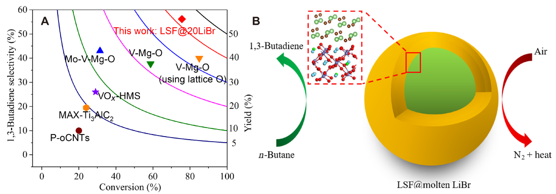 丁二烯是重要的化工原料,可用于生产合成橡胶、特种塑料等重要化工产品,但现有制备工艺存在积碳严重、产率受限等问题。研究团队创制了基于核壳结构的“钙钛矿@熔融LiBr”型催化剂,通过化学链“氧化-还原”循环反应过程,将正丁烷高效氧化脱氢为丁二烯,产率高达42.5%,远超传统氧化脱氢过程产率(~23%)。借助先进表征、量子化学和分子动力学计算,发现钙钛矿中存在的高价铁元素组分(Fe4+)可诱导催化剂表面产生过氧化物,并部分氧化熔融LiBr盐生成活性Br原子。活性Br原子可高效参与丁烷脱氢反应,并在“氧化-还原” 循环反应中实现再生。该反应机理和催化剂设计思路也为低碳烃的高效增值转化指明了新方向。