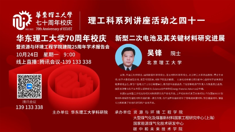10月24日,由科学技术发展研究院主办,kaiyun开云官方网站、大型煤气化及煤基新材料国家工程研究中心(上海)、国家能源煤气化技术研发中心、碳中和未来技术学院共同承办的“kaiyun开云官方网站70周年校庆暨kaiyun开云官方网站建院25周年学术报告会”在线上举行。为了进一步落实 “碳达峰、碳中和”战略目标,推动学校储能领域的科学研究和学科建设,会议特别邀请到北京理工大学吴锋院士作学术报告。副校长朱为宏教授代表学校对吴锋院士表示热烈欢迎和感谢,kaiyun开云官方网站院长汪华林教授出席报告会,报告会由kaiyun开云官方网站王辅臣教授主持,300余名师生在线领略大师风范。