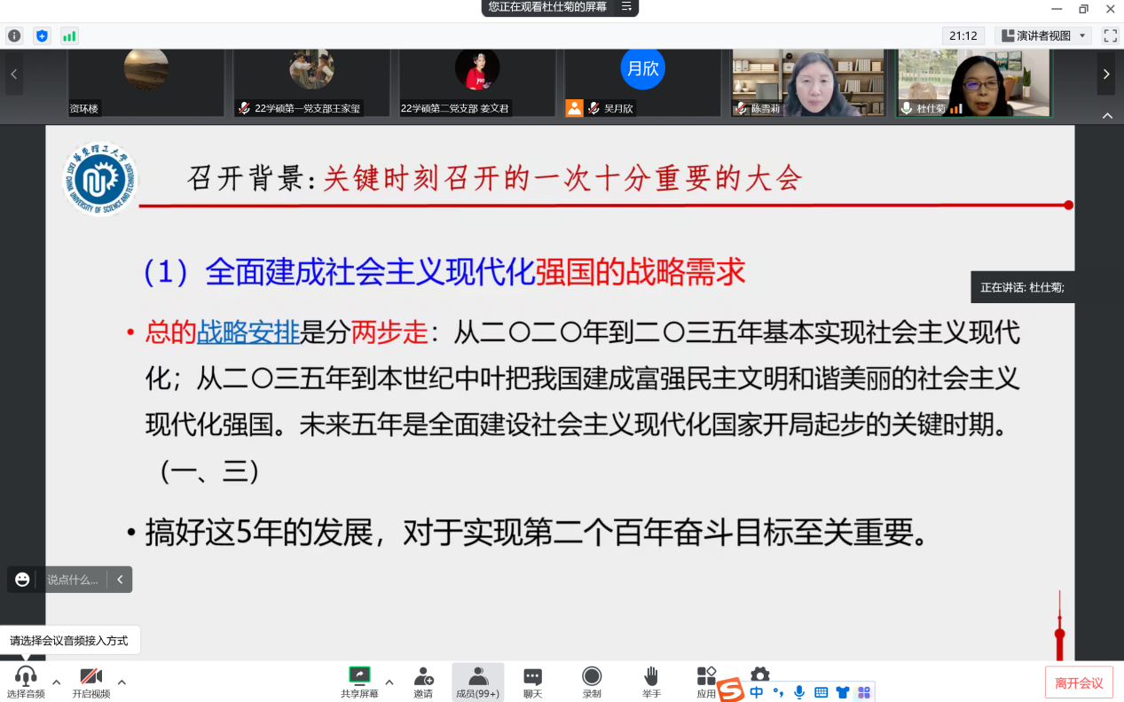 11月22日下午,资环学院通过腾讯会议形式召开“新时代学习大讲堂”政治理论学习,学院特邀学校党的二十大精神宣讲团成员、马克思主义学院博士生导师杜仕菊教授为全院师生作“以中国式现代化全面推进中华民族伟大复兴”的主题报告。报告会由资环学院党委副书记陈雪莉主持,学院教师和学生近300人线上线下参加了学习。