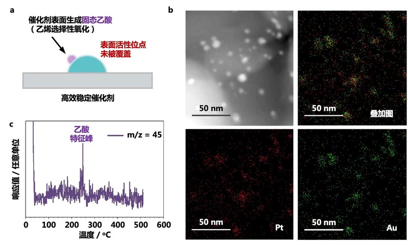 图1、(a)乙烯在催化剂表面选择性氧化为乙酸示意图,(b)催化剂电镜照片及元素扫描图谱,(c)在线质谱检测产物为乙酸