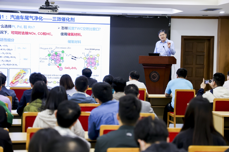 受聘仪式结束后,贺泓院士作了题为“环境催化消除化学污染”的学术报告,重点介绍了环境催化在消除气态污染物方面的国内外研究热点和应用前沿,特别是在机动车尾气催化净化和工业烟气净化方面的应用,展望了相关研究面临的挑战、对策和应用的前景。报告精彩纷呈,师生互动热烈。