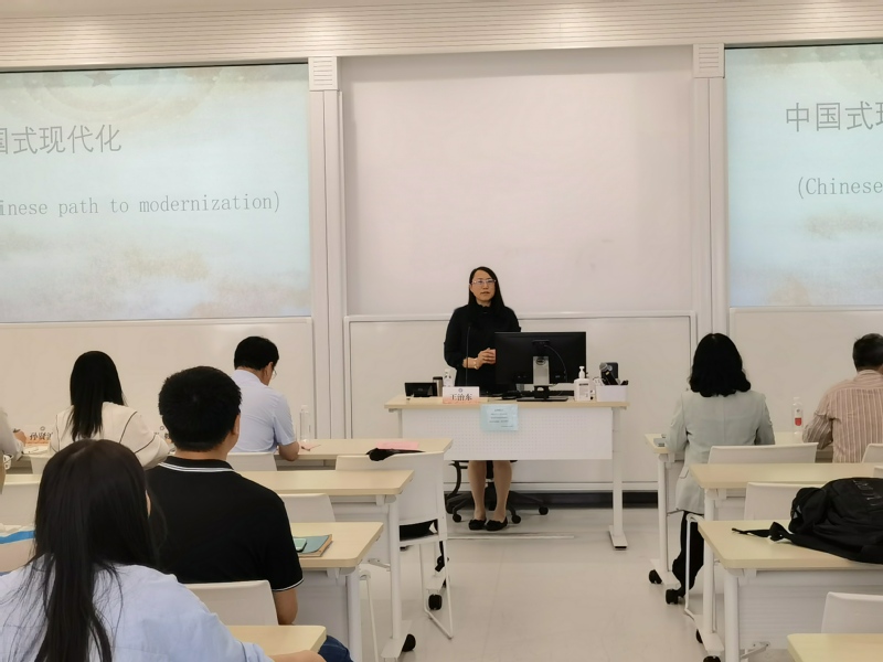 在结班仪式之前,修光利带领班子成员和党委委员分工领学、集体温故了主题教育“14项重点内容”,交流了专题读书班的学习体会。并在参加学校组织的辅导报告后,学院在实验十九楼举行了2023年第3期(总第27期)“新时代学习大讲堂”主题教育辅导报告会,特邀东华大学马克思主义学院院长王治东教授作《中国式现代化视野中的马克思主义中国化时代化》的辅导。学院领导班子、教职工和学生党员代表参加了学习。报告会由学院党委副书记、纪委书记陈雪莉主持。王治东院长图文并茂地讲解了中国式现代化的概念、内涵和五大特征,比较了西方现代化与中国式现代化的差异,从四重意义、三重逻辑、五个基本面角度阐释了中国式现代化的中国特色,并与在场师生进行了互动交流。