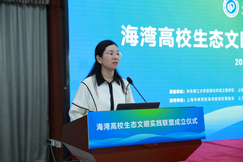 崔姗姗为联盟成立致辞。她表示,成立海湾高校生态文明实践联盟,与奉贤区委、区政府推动“三区两镇”战略实施,与奉贤区海湾镇打造上海首个全要素城镇型“低碳发展实践区”相辅相成,这不仅是高校间互通有无、取长补短、强强联合的生动实践,也为助推区域经济社会高质量发展搭建了平台,更是深入学习贯彻习近平生态文明思想的重要举措,希望海湾高校生态文明实践联盟顺利起航,共创生态文明建设崭新篇章。