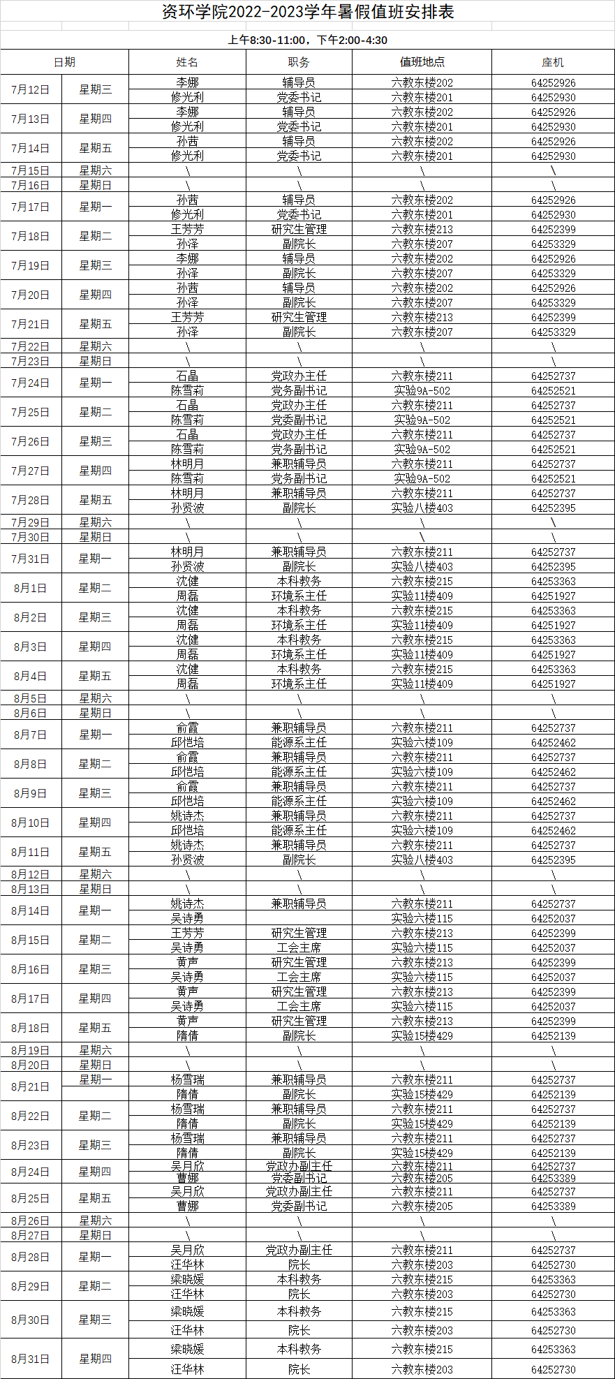 资环学院2022-2023学年暑假值班安排表