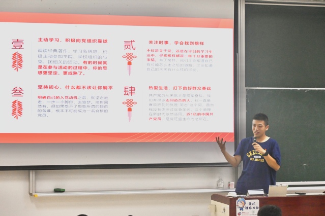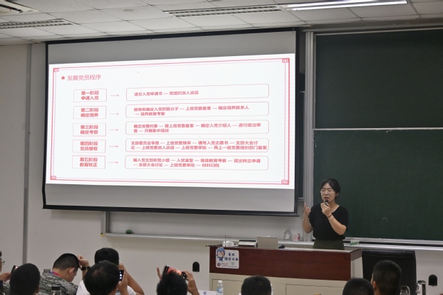 学院辅导员、本科党支部书记李娜向新生们详细介绍了入党条件和发展党员的程序流程,包括关于入党申请书的书写要求和党员的先锋模范作用的发挥等。她鼓励同学们坚定理想信念,敢于担当、勇于奉献,用实际行动向党组织靠拢。