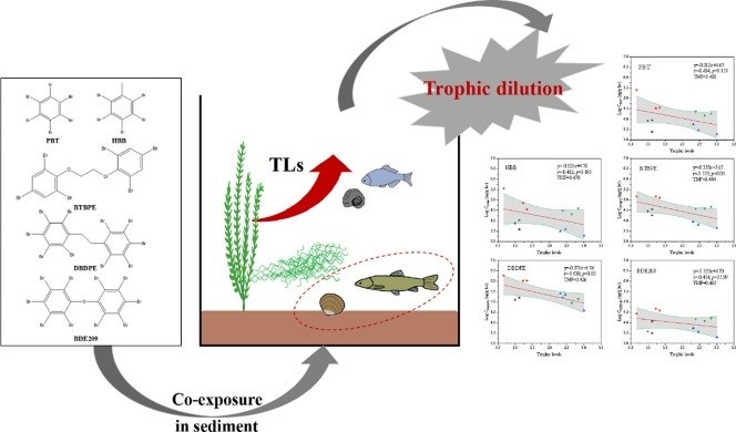 在《Water Research》论文中,研究通过人工构建的淡水食物网中短期暴露和在淡水生态系统中长期暴露两种途径,探究了五种典型溴代阻燃剂(BFRs)在体系中的分布、生物积累和不同营养级生物间的转移。短期(35天)暴露实验表明饮食摄入会影响生物体内BFRs积累水平。长期(5个月)暴露发现,部分新型溴代阻燃剂(NBFRs)在生物体内浓度与生物所处营养级呈显著负相关,表明发生了营养稀释。具有更高生物积累能力的高营养级生物可能在决定食物网中BFRs的营养放大潜力方面发挥关键作用。该论文为评估食性对BFRs生物积累和放大的影响,以及其在水生态系统中的归趋和风险提供了基础数据。