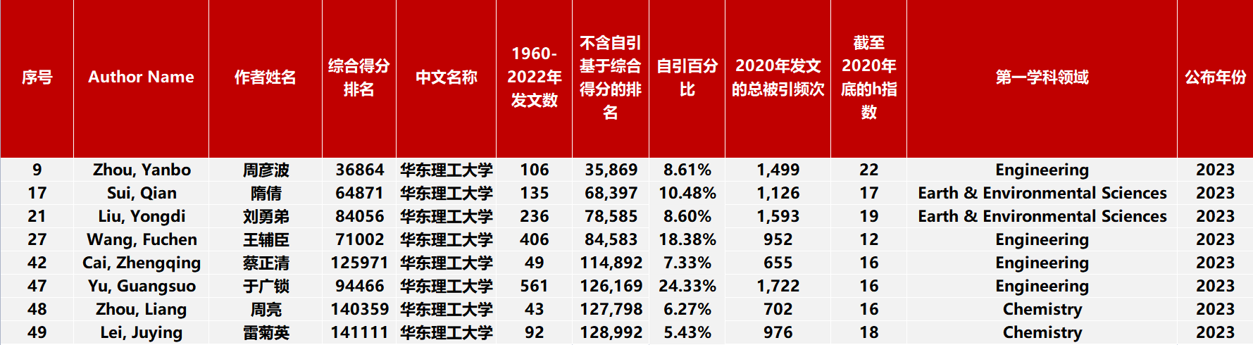 近日,美国斯坦福大学发布了2023年度全球前2%顶尖科学家榜单(World’s Top 2% Scientists 2023)。 在此榜单中,我院教师王辅臣教授、于广锁教授入选“终身科学影响力排行榜(1960-2023)”;此外,刘勇弟教授、王辅臣教授、于广锁教授、周彦波教授、隋倩教授、雷菊英、蔡正清以及周亮老师入选“年度科学影响力排行榜”。