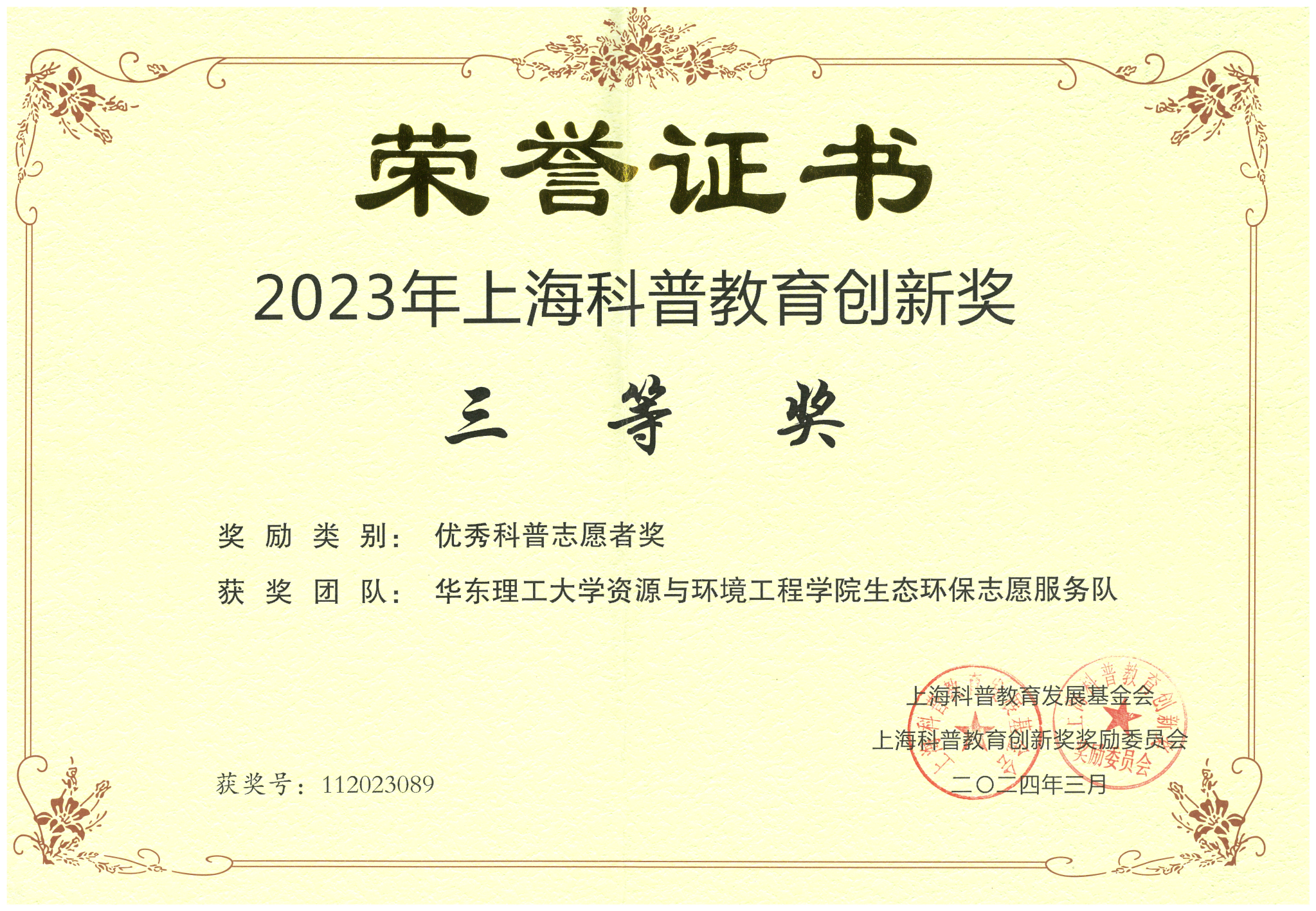 3月23日,第十二届上海科普教育创新奖颁奖典礼在沪举行,表彰上海市为科普事业做出突出贡献的个人和组织。kaiyun开云官方网站生态环保志愿服务队荣获2023年上海科普教育创新奖优秀科普志愿者奖(团队)三等奖。