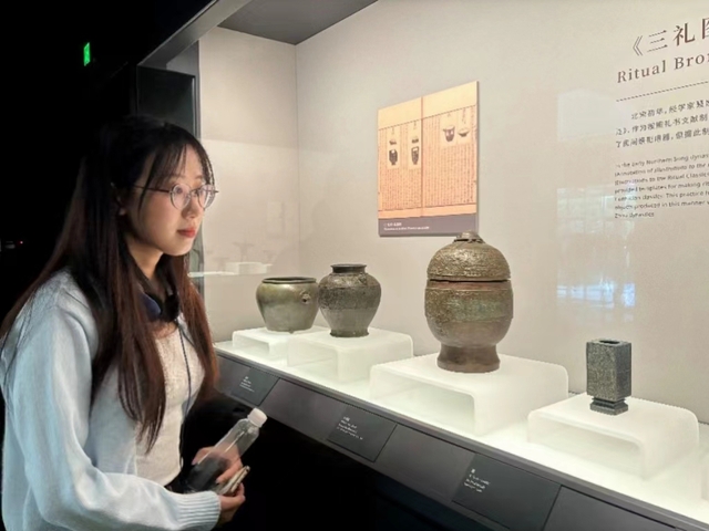 同学们来到中国古代青铜器展馆。全馆按照时间线对展品进行布展,让观众们在时间的纵深中感受中国古代文明和青铜器的发展和演变。从夏晚期的镶嵌十字纹方钺、束腰爵,到北宋的大晟蕤宾中声钟,再到镇馆之宝大克鼎。那些历经千年沧桑的文物,不仅是历史的见证者,更是美的载体。它们或古朴典雅,或华丽辉煌,每一道线条、每一抹色彩都蕴含着古人的智慧与匠心。同学们在这些文物前驻足,细细品味它们所散发出的独特韵味,仿佛能听到古人的低语,感受到那份穿越时空的美。