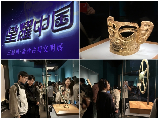 从青铜器展馆的震撼中走出来后,同学们来到了上海博物馆东馆全国28家文博考古机构携手推出“何以中国”文物考古大展系列第三展——“星耀中国:三星堆·金沙古蜀文明展”金面具、青铜大立人像、青铜神树、十节玉琮……数量众多的文物展现了古蜀先民浪漫的想象力和非凡的创造力着力呈现古蜀文明与不同族群和文化的交流互动置身其中,同学们也充分领略古蜀文明的辉煌灿烂以及中华文明的多姿多彩和博大精深