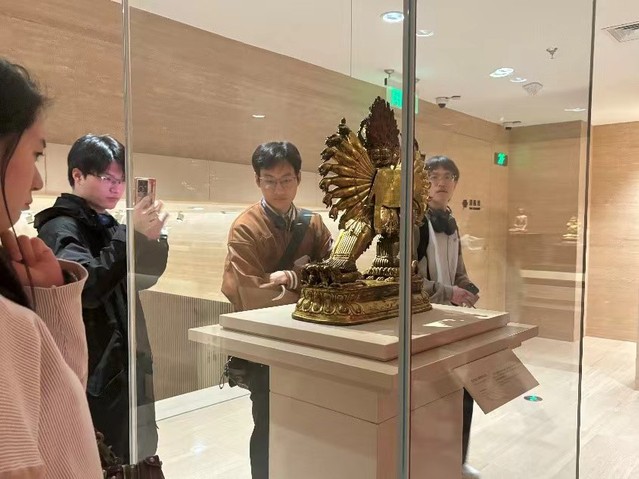 在中国古代雕塑展厅,正对大门的便是摆在高挑展厅中央的金代漆金彩绘木大势至菩萨像,配合着头顶的旋转光影,吸引着同学们纷纷驻足。深入展厅,隋朝的石观音菩萨像、唐朝唐三彩、北宋的漆金彩绘木观音菩萨等等,每一尊雕像面容都栩栩如生、特色鲜明。同学们不时交流彼此的观赏感受,展品历经千年依旧栩栩如生的细节让大家对古代雕塑产生了更深的兴趣,也激发了大家对中国传统文化的自豪与自信。