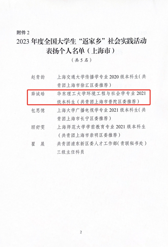 近日,共青团中央发布表扬信,对2023年度全国大学生“返家乡”社会实践活动中表现突出的组织单位、个人和特色项目予以通报表扬,资环学院2021级环境工程社会学(双学位)专业薛诚皓同学获评2023年度全国大学生“返家乡”社会实践活动表扬个人。