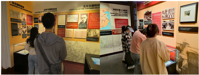 最后,党员们来到了中国劳动组合书记部旧址陈列馆,《追随与奋斗》石像雕塑屹立在右侧,传达出中国工人阶级的澎湃力量。通过浮雕、蜡像、场景和多媒体演示等,党员们学习了中国劳动组合书记部在中国共产党领导下,举办工人夜校、宣传马列主义、帮助工人组织工会和领导罢工斗争,掀起第一次工人运动高潮的斗争历程。