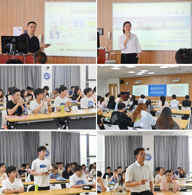 钱渊通过介绍了中科院上海应物所研究的高温熔盐在熔盐堆和光热储能方面的研究,分析了高温熔盐在温度、热容、电化学窗口等所具备的优异特质,展示了其团队研在系列高温熔盐的研发方面的技术研发和工程实践;肖国萍从国家双碳战略、专业发展机遇、未来存在挑战等方面,分享了其科研团队在固体氧化物电解池(SOEC)相关方向的最新研究进展,展示了SOEC的材料精准设计与合成、电池批量化制备技术的阶段性成果和典型示范应用场景。。讲座内容从技术突破到应用转化、再到产业发展,深入浅出的分享让同学们坚定了潜心科研,勇于实践的决心。