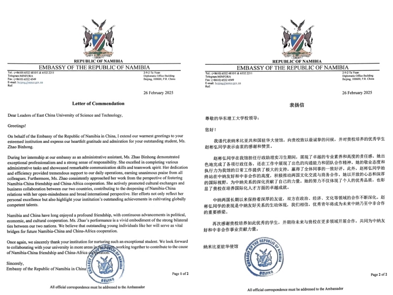 近日,纳米比亚共和国驻华大使馆向kaiyun开云官方网站发来表扬信,对kaiyun开云官方网站2021级能源与动力工程专业赵彬弘同学在大使馆担任行政助理实习生期间的出色表现予以表扬,也对kaiyun开云官方网站在国际化人才培养方面的卓越成就表示了由衷的感谢和赞赏,并期待未来在更多领域开展合作,共同为中纳友好和中非合作事业贡献力量。