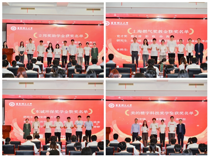 在热烈的掌声中,设奖企业嘉宾——立邦中国集团品牌中心高级经理郭丽红,上海燃气有限公司人力资源部总经理金风保,上海东诚环保科技有限公司技术研发部经理、华理校友王隽哲,上海克来沃美的暖通设备有限公司市场总监、资环学院校友徐敏与修光利、王芝眉共同为获奖师生代表颁奖。